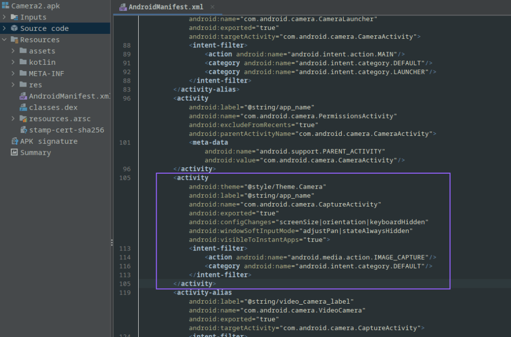 Pour permettre aux autres applications d’utiliser cette fonctionnalité, Camera expose son composant Activity
