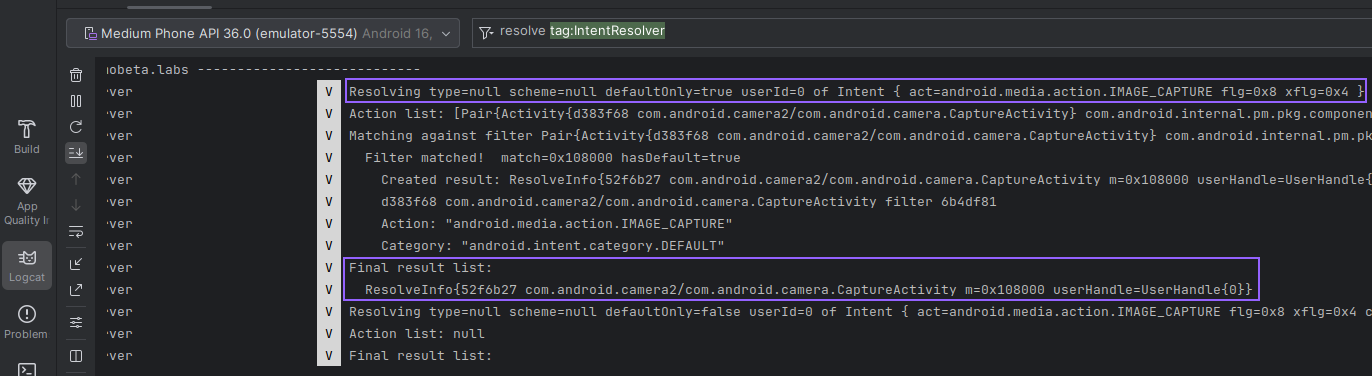 En lançant l’application et en regardant les logs, on voit comment Android résout l’Intent :